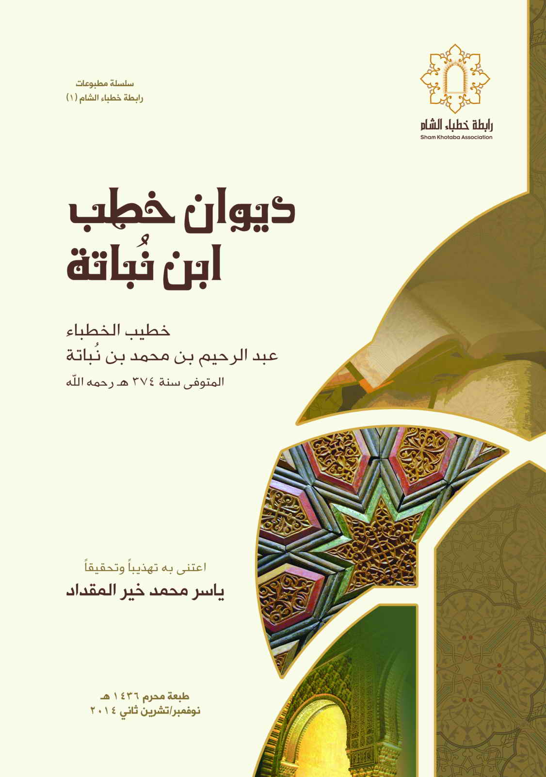 وبعد: أضع بين يديك أيها الخطيب الألمعي هذا السِّفر الفذّ في بابه، الذي طبّقت شهرتُه الآفاق: ديوان خطب ابن نباتة،المتوفى سنة أربعمئة وثلاث وسبعين للهجرة(473ھ) إذ هو بحقٍّ روضةٌ أدبية ومادة ثرية للخطيب من حيث غزارة وفرادة المفردات والتراكيب، وجزالة التعابير، وحسن الاستعارة، وروعة التشبيه مع الحفاظ على قوة المعاني والمضامين .